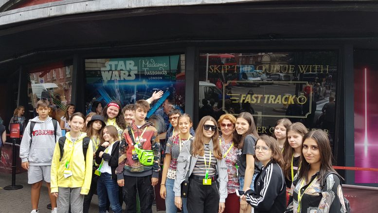 In timpul vizitei am fost intr-adevar foarte ocupati, „invitati” fiind de Bill Clinton sau Donald Trump, de membri ai familiei regale si faimoși cântăreți de muzică ori scriitori ai vremurilor trecute, sa facem cate o scurtă sedinta foto”. Cu regret ne-am despărțit de toate personajele din muzeu pentru ca…. după masa de pranz ne așteptau orele de după-amiază. Acestea au trecut pe nesimtite la gandul ca seara ne aștepta o plimbare cu Emirates Cable Cars peste Tamisa traversând de la Greewich Peninsula către Royal Docks. Excursia, in cabine suspendate ce sosesc exact la 30 de secunde durează aproximativ 30 de minute si constituie o încântare privind atractiile Londrei. Priveliștea de care ne-am bucurat a fost cu atât mai captivantă cu cat seara inainta, iar spectacolul din fata ochilor era unul feeric, de poveste. Am făcut apoi o plimbare prin O2 North Greenwich Arena Shopping Center, un complex construit in 2007 in forma unui dom urias. E un loc plin cu restaurante, baruri, vestitul stadion Arena, gazda celor mai mari concerte si spectacole susținute de artiștii internațional de renume. Nu ne-am imaginat nicio clipă că ar putea existat un „oras” construit intr-un alt oras. Seara s-a încheiat în liniste in campus, istoviti de oboseala dar îmbogățiți de tot ceea ce am văzut și acumulat peste zi. Ce poate fi mai frumos?