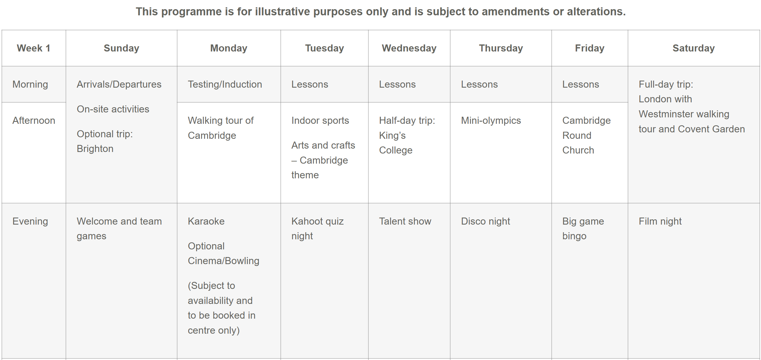 In programul** taberei de 1 saptamana sunt incluse 2 vizite la obiective turistice din Cambridge si 1 excursie in afara orasului (transport cu autocar/tren inclus):