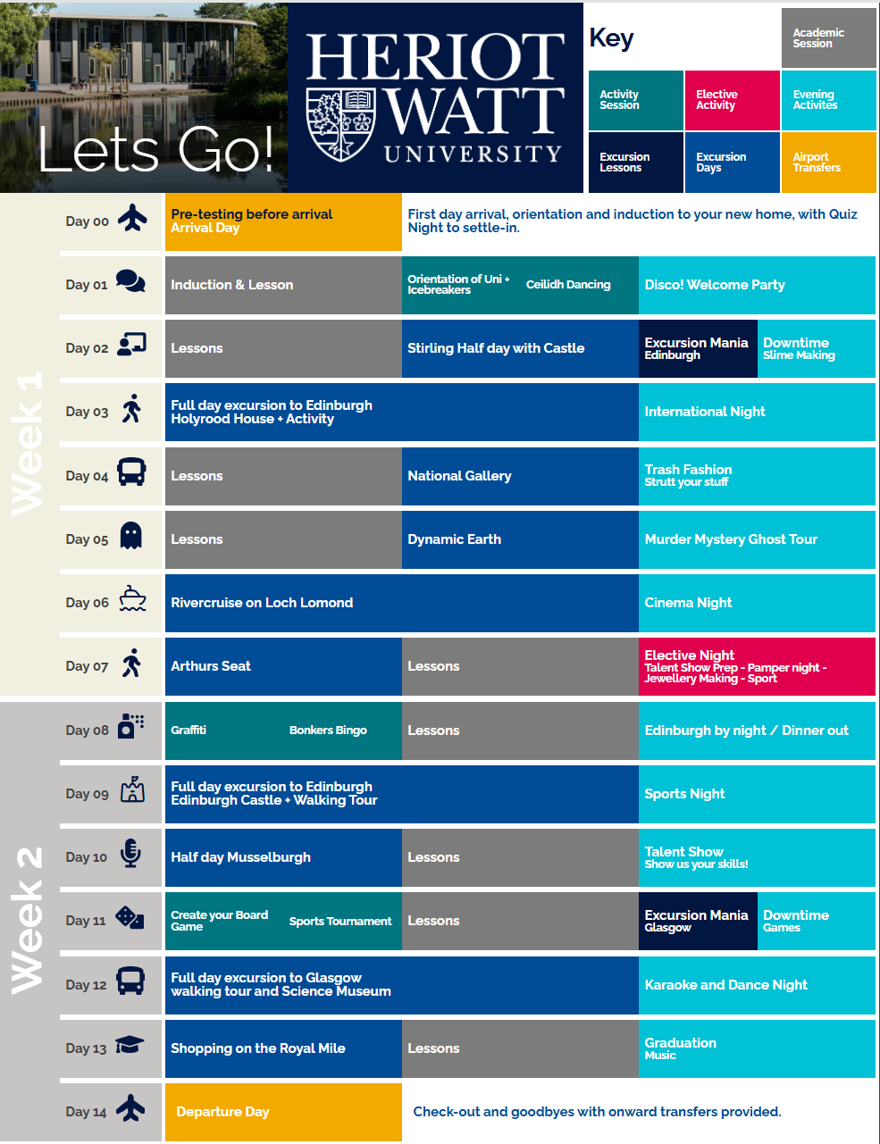 Tabara de limba engleza se desfasoara in cadrul campusului Universitatii Heriot-Watt, care se afla la aprox. 30 min de centrul orasului Edinburgh, intr-o zona verde si atractiva. Facilitatile campusului includ: sala de mese moderna, sali de clasa bine echipate, terenuri de sport atat acoperite cat si in aer liber, magazin, biblioteca, banca, dar si cateva cafenele. Heriot-Watt University este o locatie excelenta pentru o tabara internationala de limba engleza, un loc ideal de plecare atat pentru explorarea orasului, cat si a imprejurimilor.