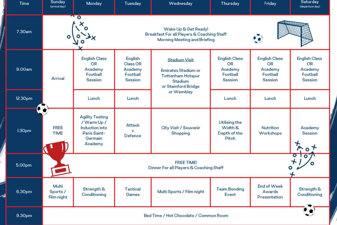 Programul rezidential de la Royal Hospital School le ofera jucatorilor sansa de a se antrena pe terenuri naturale superbe, inconjurati de peisajul rural pitoresc din Suffolk. Jucatorii se antreneaza cu antrenori calificati UEFA, care sustin, de asemenea, ateliere in domenii precum: forta si conditie fizica, nutritie si recuperare, printre altele. Suportul pastoral si atentia catre participanti sunt asigurate in permanenta. Fiecare jucator va invata sa joace respectand valorile Academiei Paris Saint-Germain: lucrul in echipa, autocontrolul si respectul reciproc intre coechipieri. Academia Paris Saint-Germain UK este dedicata educarii si dezvoltarii tinerilor jucatori de fotbal si, prin urmare, se concentreaza pe dezvoltarea abilitatilor individuale si a bunastarii sociale a fiecaruia. Jucatorii vor avea oportunitatea sa joace fotbal, sa isi faca prieteni noi si sa isi dezvolte abilitatile intr-un mediu relaxat si distractiv, la finalul taberei, se va organiza un turneu de fotbal si fiecare elev va participa si la o sesiune de feedback one-to-one direct cu antrenorii.